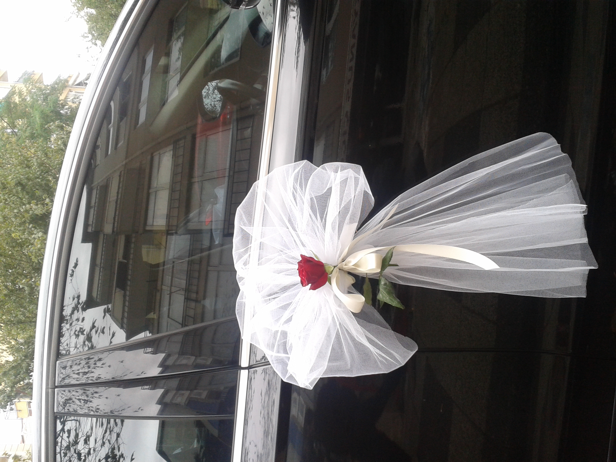 |Gelin Arabası| arka cama gelin ve damat isimleriniz baş harfleri Papatya Çiçekleriyle yazılışı,kapı kollarına tülden fiyonkla sade bir ,|gelin Arabası Süslemesi|, Çalışması.